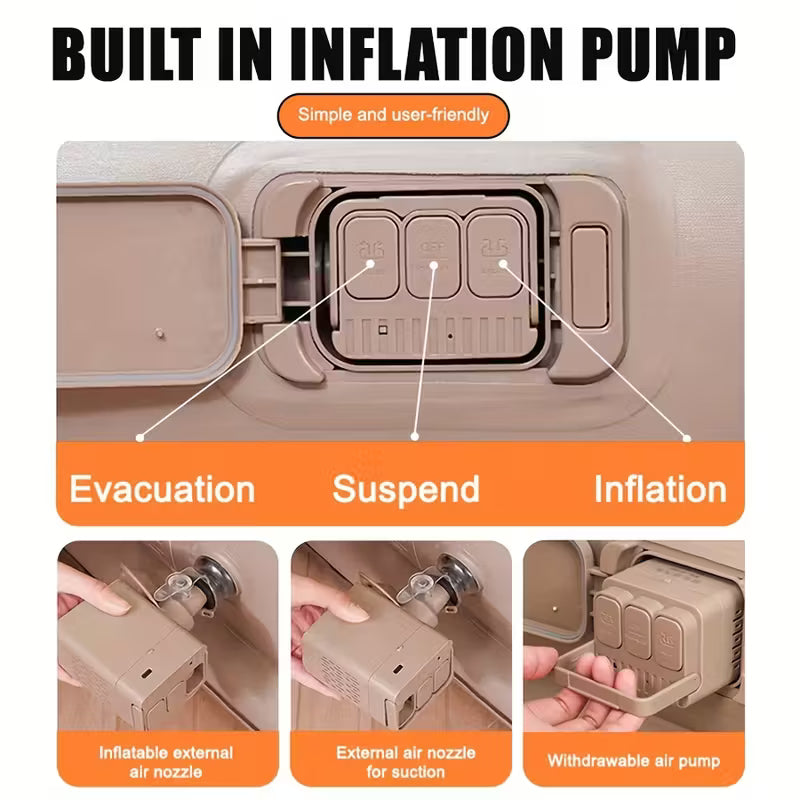 مضخة كهربائية مدمجة (كما هو موضح في الصورة) - قم بالنفخ أو التفريغ أو التوقف باستخدام المضخة المدمجة - لا حاجة لأدوات خارجية.