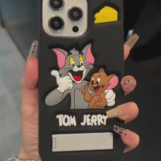 جراب هاتف ثلاثي الأبعاد برسومات كرتونية توم وجيري - جراب سيليكون مرح وملون يتميز بالثنائي الكرتوني الشهير، مع زخارف الجبن وحامل مدمج من أجل المتعة والوظيفة.