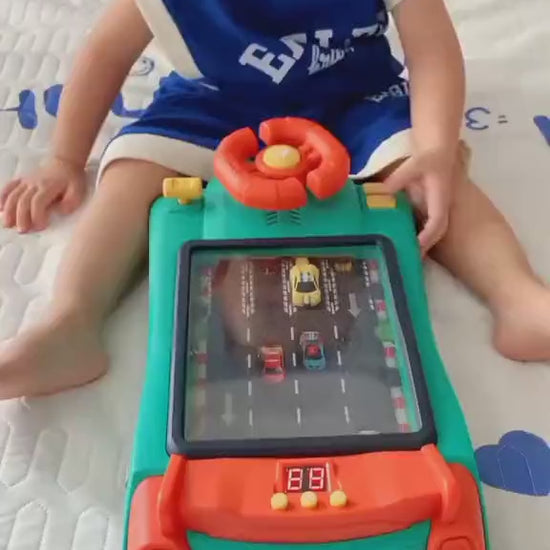 محاكاة القيادة باستخدام عناصر تحكم حقيقية - يقوم الأطفال بتدوير عجلة القيادة لتجنب السيارات القادمة؛ إذا اصطدموا، يتم إعادة تعيين اللعبة، مما يعلم التركيز والتوقيت.