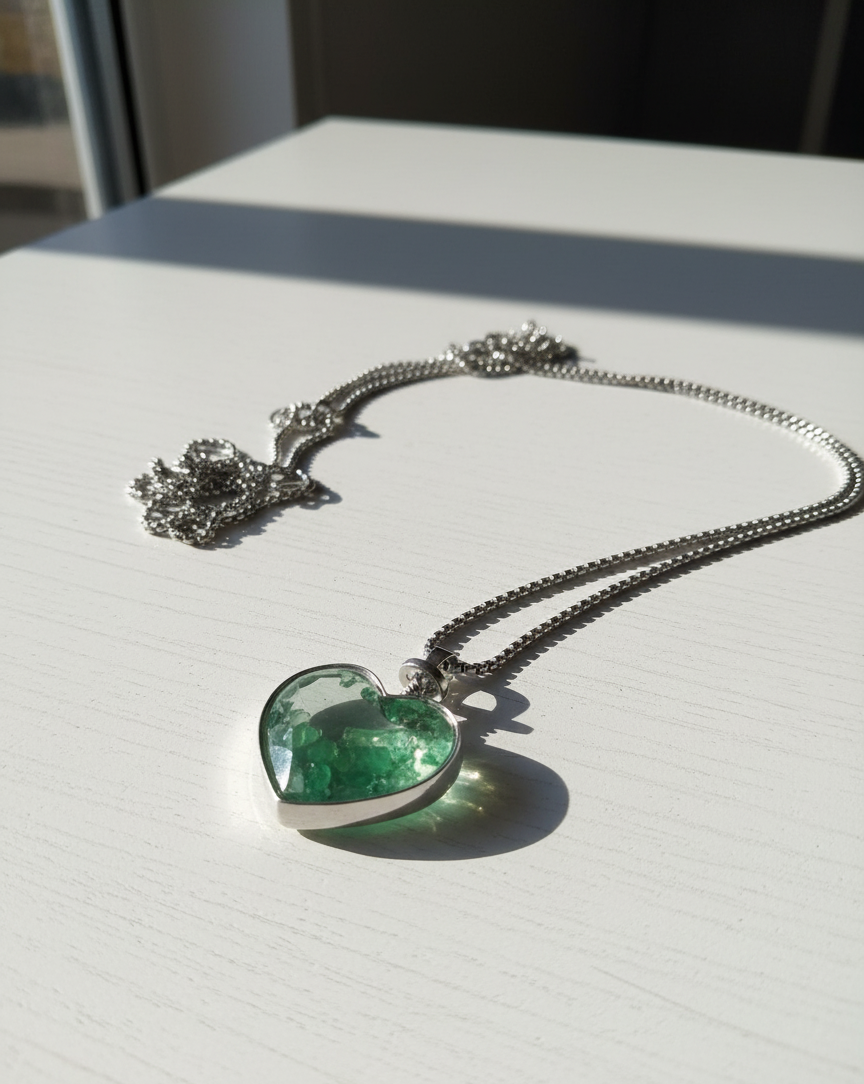 تتميز قلادة القلب الزمردي الكريستالية بقلادة شفافة على شكل قلب مليئة برقائق الكريستال الخضراء، مما يوفر مظهرًا منعشًا مستوحى من الطبيعة 🌿.