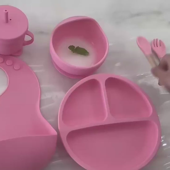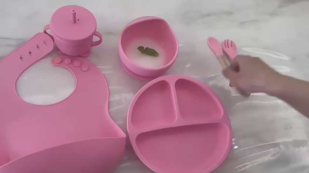 مجموعة تغذية مكونة من 7 قطع (صورة + ملصق): تتضمن مريلة سيليكون، وطبقًا مقسمًا، ووعاءً، وكوبًا للأطفال، وملاعق/شوك متعددة - مثالية للاستخدام في الوجبة الكاملة.