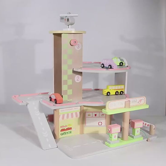 The Urban Drive™ Garage is a three‑level wooden parking and service station complete with ramps, a rotating helipad, fuel pumps, car wash bay, and city storefront. Designed for ages 3 and up, this compact playset encourages imaginative vehicle play, role‑play storytelling, and fine‑motor skill development.
