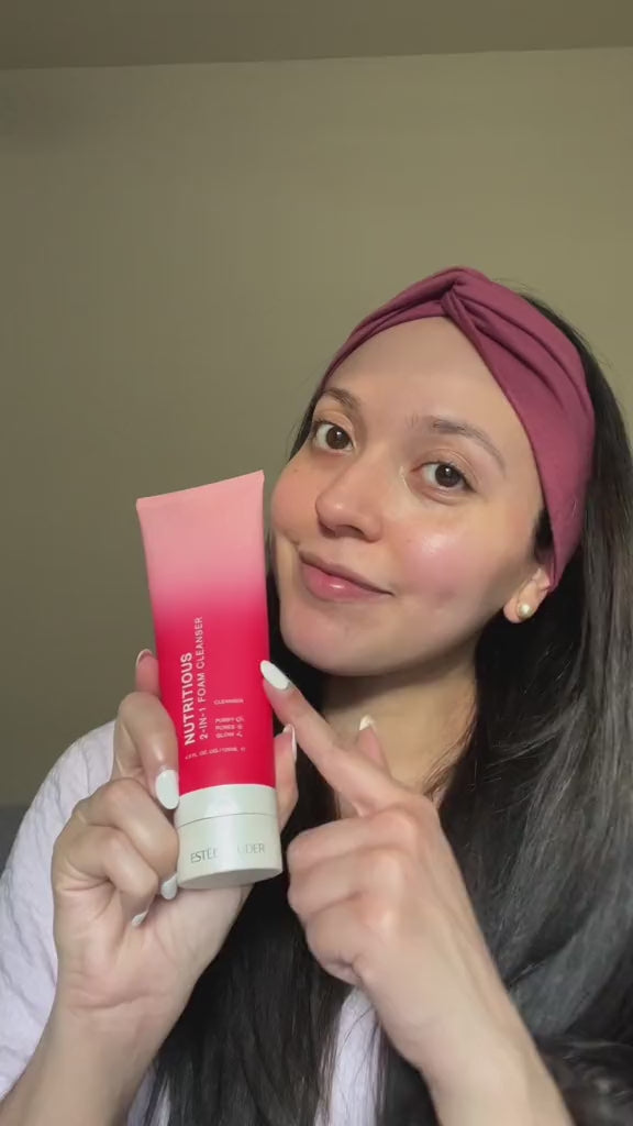 Estée Lauder Nutritious 2-in-1 Foam Cleanser – A naturally derived facial cleanser and mask powered by sweet kelp, red algae, and coconut water ferment to purify pores and boost glow.