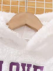 • πŸ’œ White fur hoodie with β€œLOVE” text (front label) β€” Soft, fluffy fabric designed for warmth and comfort.